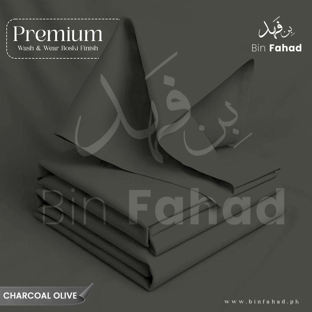 Upgrade your style with a 4-meter premium Wash & Wear Boski Finish men's suit fabric in Charcoal Olive color. Soft, breathable, wrinkle-resistant, and ideal for all seasons.